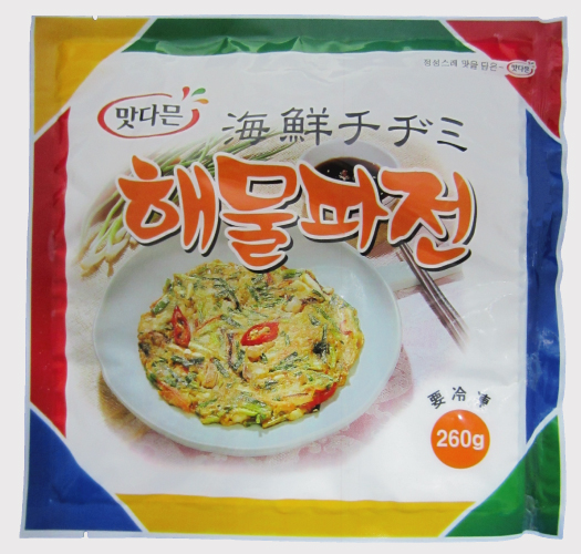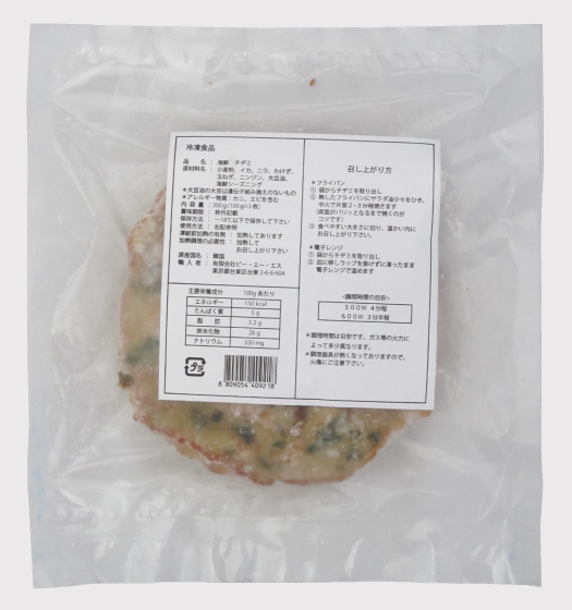 | 原材料 | チヂミ粉(小麦粉・砂糖・塩・玉ねぎ粉末・にんにく粉末・マルトデキストリン・イースト)、ニラ、イカ、わけぎ、玉ねぎ、にんじん、海鮮シーズニング、大豆油、pH調整剤、調味料(有機酸) (原材料の一部に、カニ、エビを含む) |