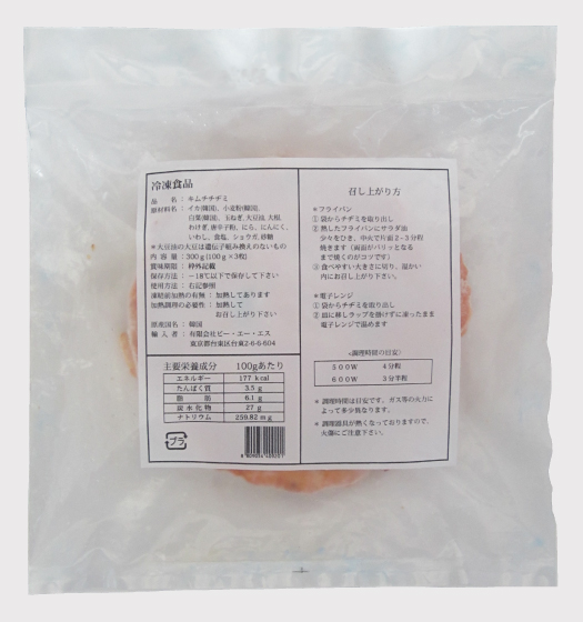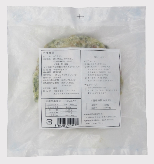 | 原材料 | チヂミ粉(小麦粉・砂糖・塩・玉ねぎ粉末・にんにく粉末・マルトデキストリン・イースト)、ニラ、イカ、キムチ(白菜・唐辛子・にんいく・生姜・塩)、玉ねぎ、大豆油、pH調整剤、調味料(有機酸) | |